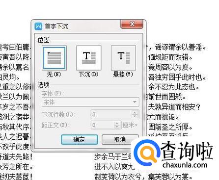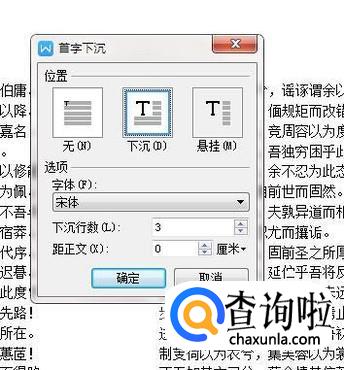 在弹出的“首字下沉”的对话框里面,将“位置”调整为“下沉”,下沉行数根据需要进行调整,小编调整的是3行,还可以调整字体等,点击确定。