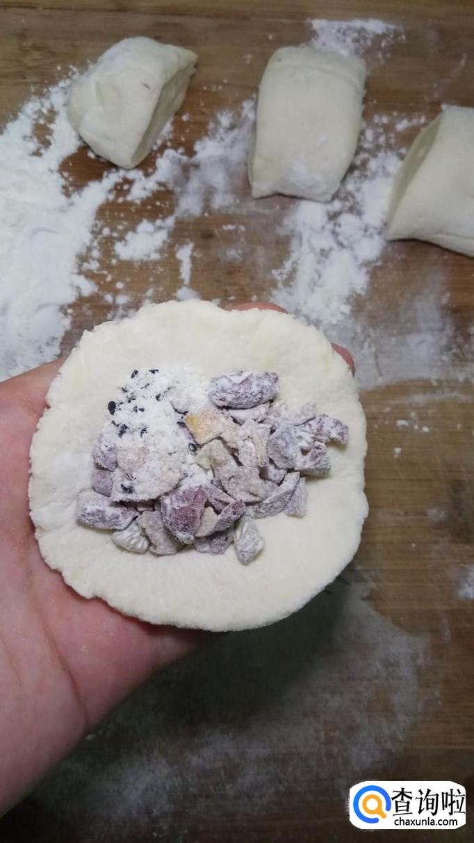 将小剂子擀成圆的薄片,然后将做好的糖馅儿,放到圆片儿中,用手捏出花纹,做好糖包子。
