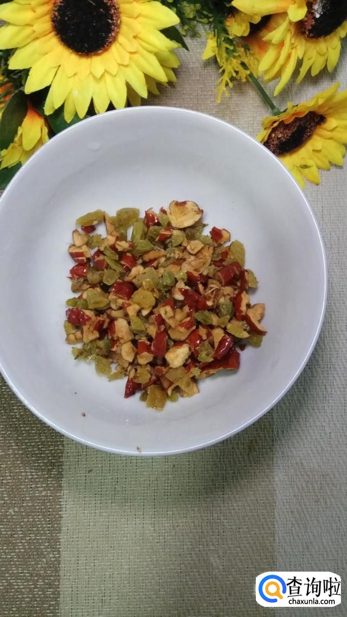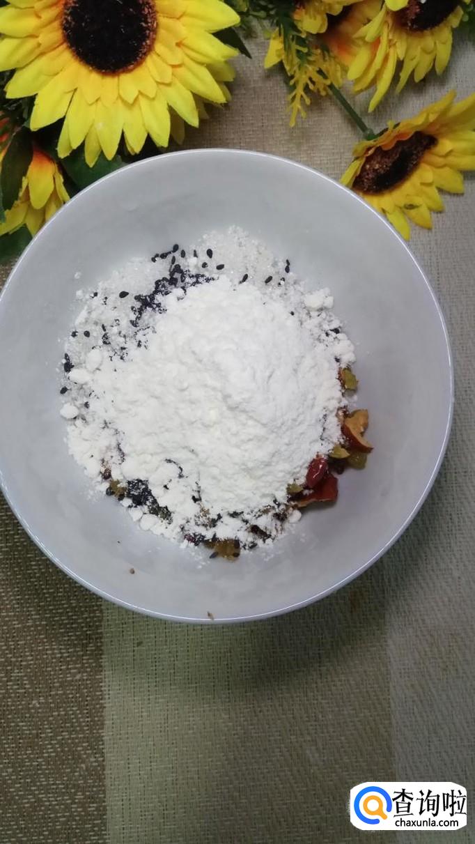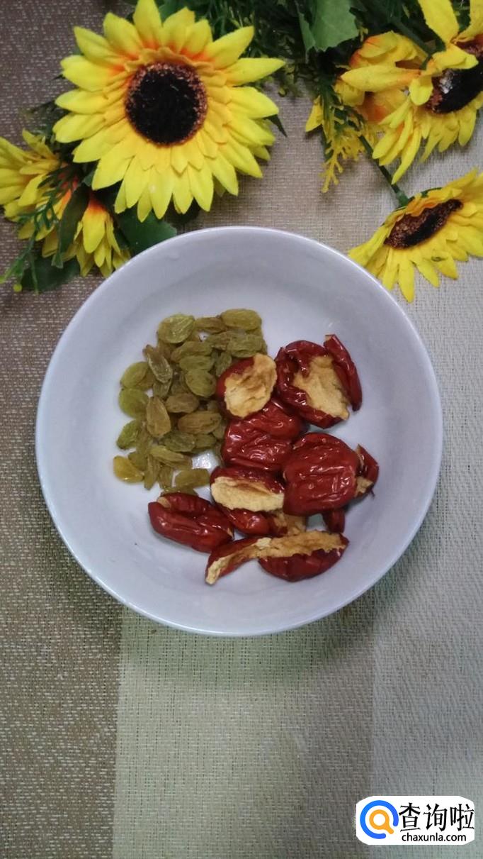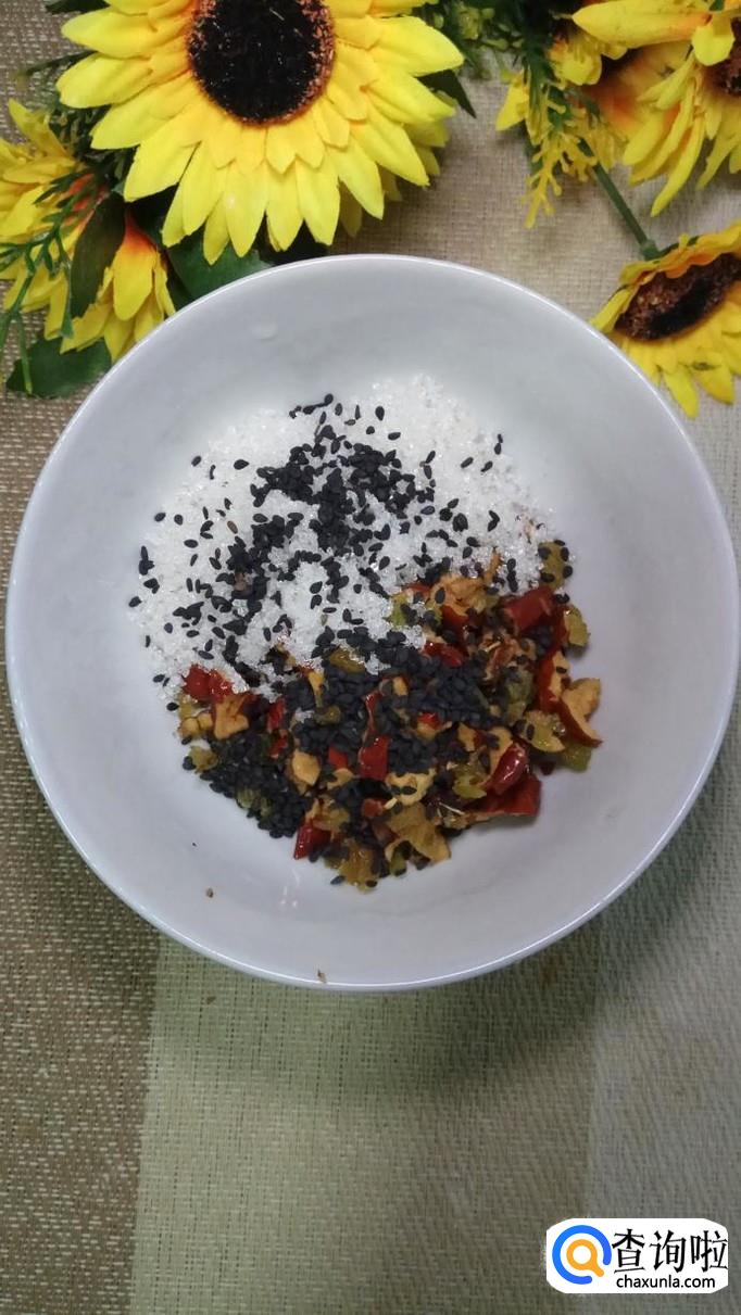 准备适量葡萄干和红枣,将红枣去核,然后用刀将葡萄干和红枣切碎,加入适量的白砂糖和黑芝麻,白砂糖可以少放一些,因为葡萄干和红枣本身已经非常甜了。
