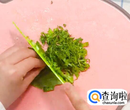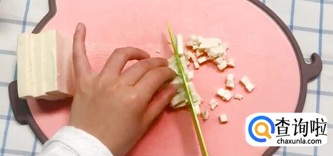 豆腐洗净切块,青菜叶切丝。