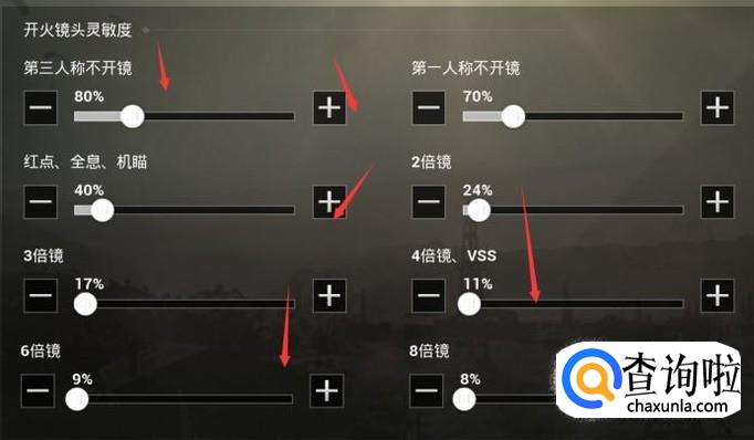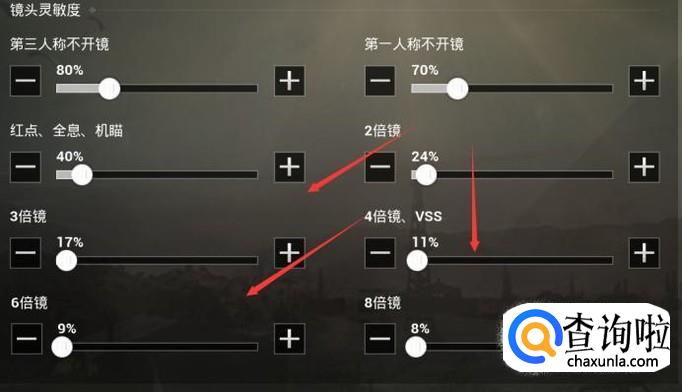 在镜头的灵敏度上,着重说一下八倍镜,八倍镜因为距离射击是比较远的一般情况设置在百分之八左右。