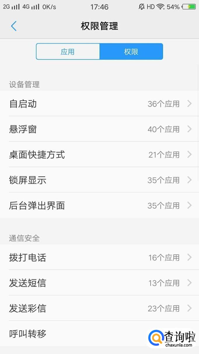 有些应用程序出现闪退的情况可能是因为软件的权限问题导致的,去安全中心去设置一下权限即可,如图所示。
