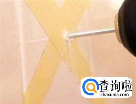 用钢钉一枚,在瓷砖上面轻轻凿出一个特别小的孔,因为有胶带贴着,所以不用担心瓷砖开裂,但也要轻一些。