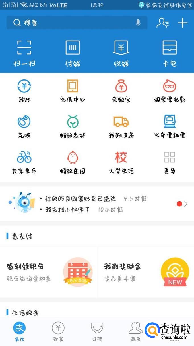 首先打开支付宝,在支付宝首页的顶端,就有收钱码和付款码的选项。