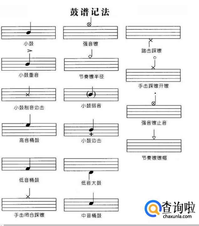 架子鼓的记谱用五线谱的低音谱表。五线谱的五条线,从下往上依次叫做,第一线,第二线,第三线,第四线,第五线。五线谱的四个间,从下往上依次叫做,第一间,第二间,第三间,第四间。五鼓分为,底鼓,军鼓,高音桶鼓,中音桶鼓,低音桶鼓。分别在的位置为,下加一间,第三线,第四间,第三间,第一间。三镲:吊镲,节奏镲,踩镲。踩镲有三种击打方式分别为,用脚踩踩镲,手击闭合踩镲,手击开镲音。