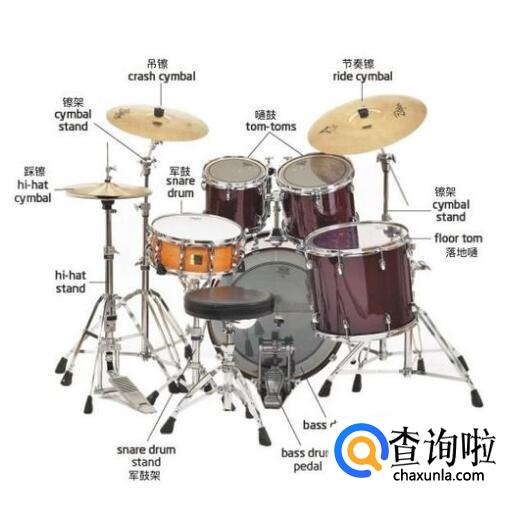 架子鼓是由低音大鼓、踩镲、军鼓、嗵鼓、镲片所组成。