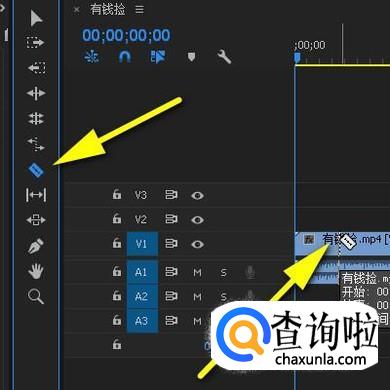 序列面板左侧是工具箱,我们从这些工具中对视频或音频进行剪辑。比如,要把视频裁为3段,那么点剃刀工具,在视频上找到目标位置点击一下即把视频裁剪两段了,再在另一处点击一下又裁剪出另一段。