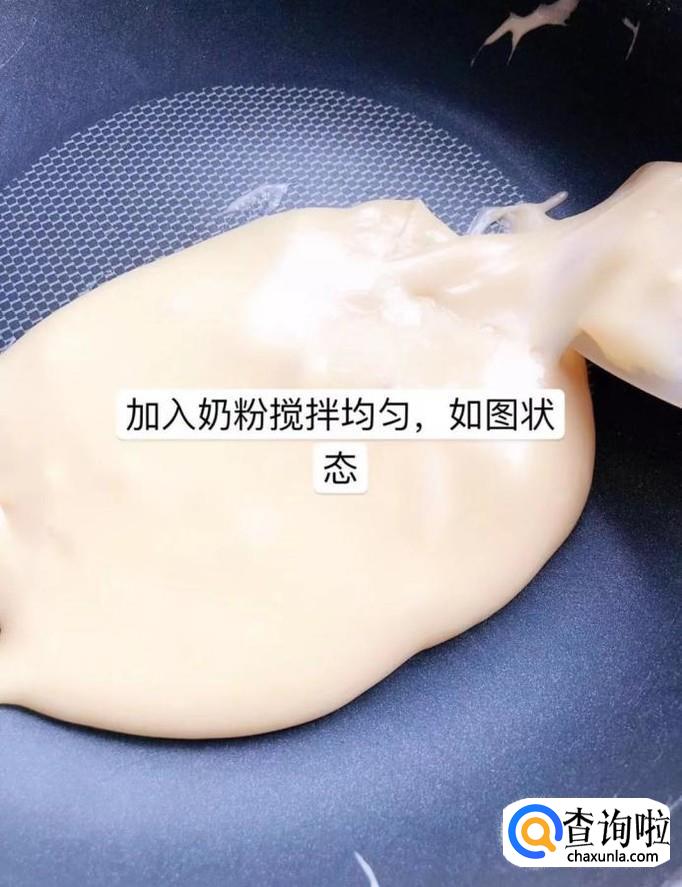 然后往锅中加入适量的奶粉搅拌均匀,搅拌成如下图的粘稠度就可以了。