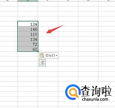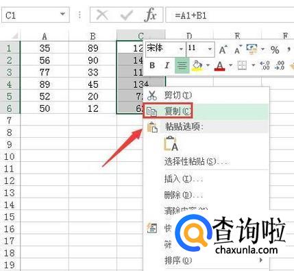 输入好公式以后按下回车键得到计算的结果,然后再使用鼠标左键拖放下来就得到了所有的计算结果,将所有的结果全部选择,单击鼠标右键找到复制选项,如图所示: