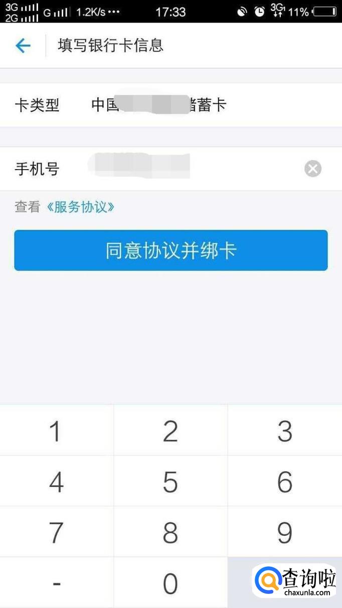 输入在银行注册银行卡时留的手机号,然后点击同意协议并绑卡。