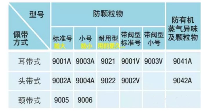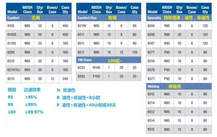 目前市面上的3M口罩主要有三种标准,其对应的不同型号,防护作用也不尽相同。