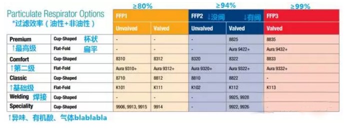 以上是市场上的3M口罩的三种国际或国家标准,总体隔离效果基本FFP2=P95=R95=95%左右,FFP3=P99=R99=99%左右。对于每一种标准的每一个类别都会有不同的型号产品用于不同的分行业或工种。