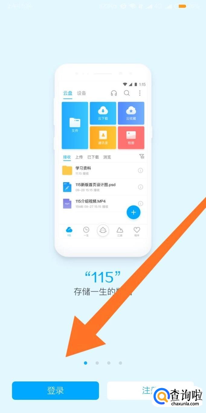 我们首先进入155网盘的手机客户端,然后点击屏幕左下角的“登录”。如果还没有115网盘的账号,点击屏幕右下角的“注册”即可。