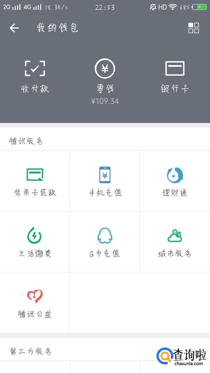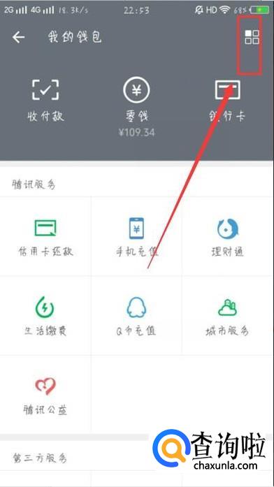 在“钱包”页面,点击图示位置,进入支付中心,如图所示。