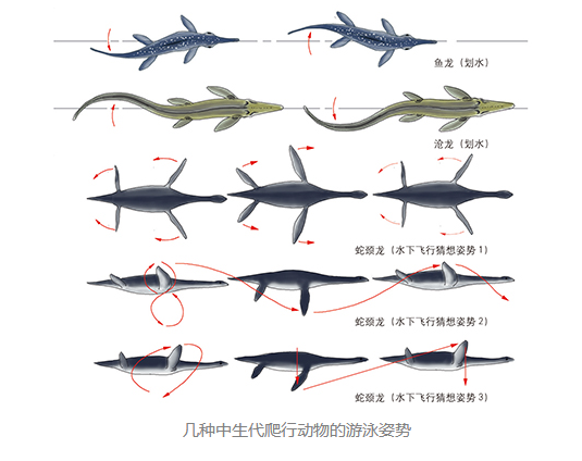 中生代,有很多爬行动物生活在水中,它们包括各种各样的鱼龙、沧龙、鳍龙、齿龙、海龙以及离龙。这些爬行动物在水环境中遇到的第一个问题就是该如何运动,或者说该怎样游泳。由于它们没有留下直系后代,因此只能根据化石资料和现生海生爬行动物的游泳姿势加以推断。