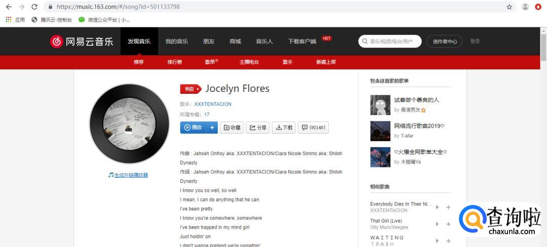 在播放界面可以看到,最上方浏览器搜索栏中的歌曲的ID,把歌曲ID记下来。