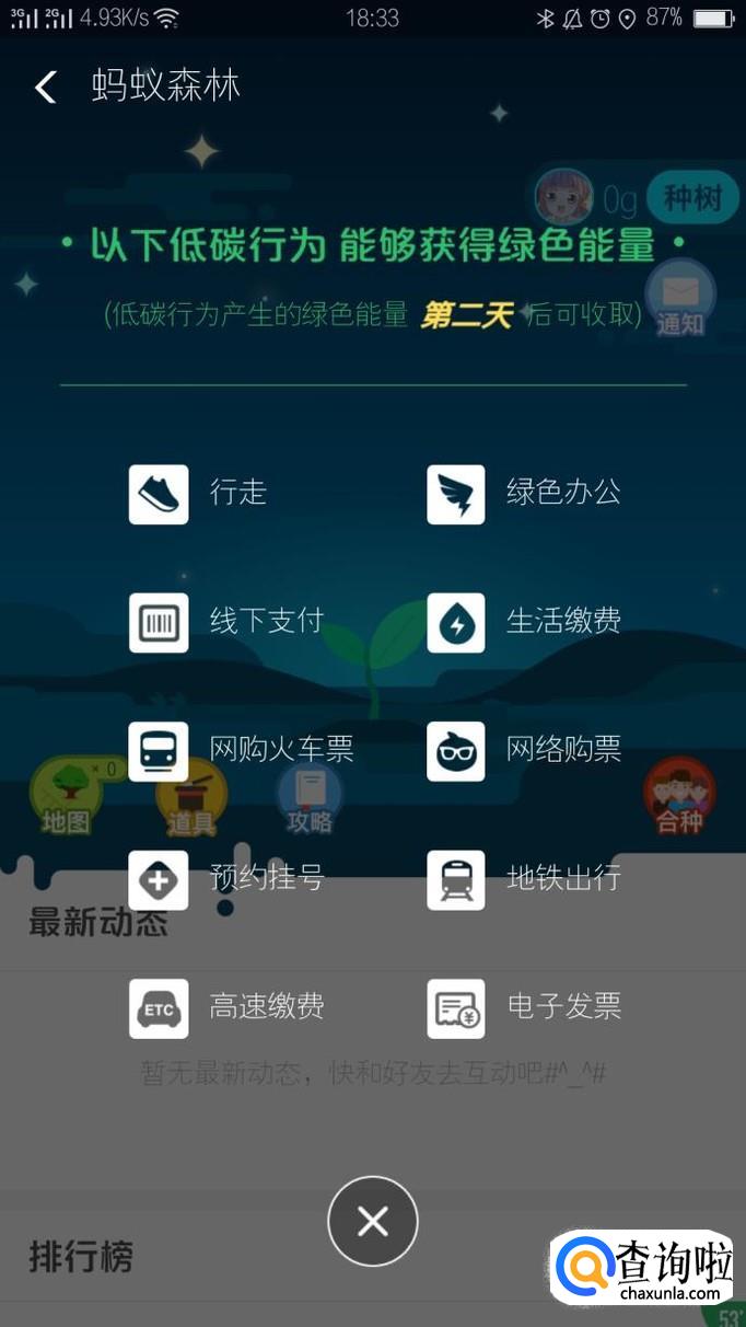 收取能量球之后,会有一个提示:以下低碳行为,能够获得绿色能量。然后我们了解图片内容之后,点击X关闭页面。内容如下图所示。