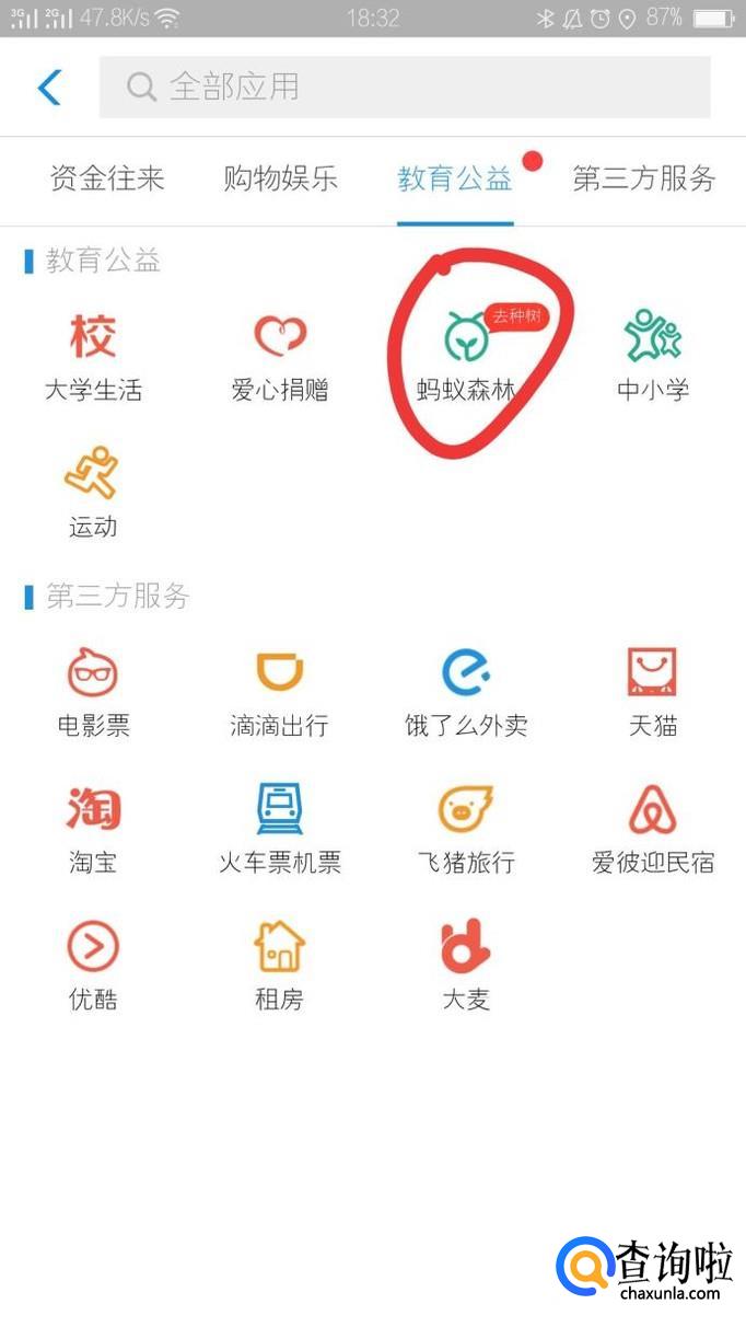 在更多选项中找到教育公益中的“蚂蚁森林”,点击进入蚂蚁森林。如下图红色标注内容所示。
