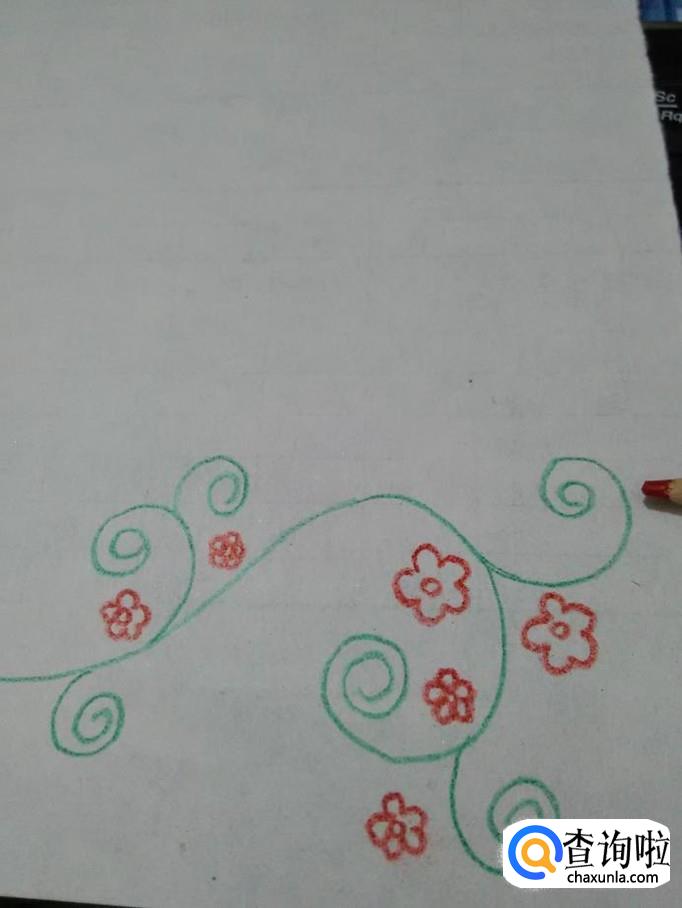 在每个花芯的周围,画五条相连的弧线,表示花瓣,花藤就画完了。