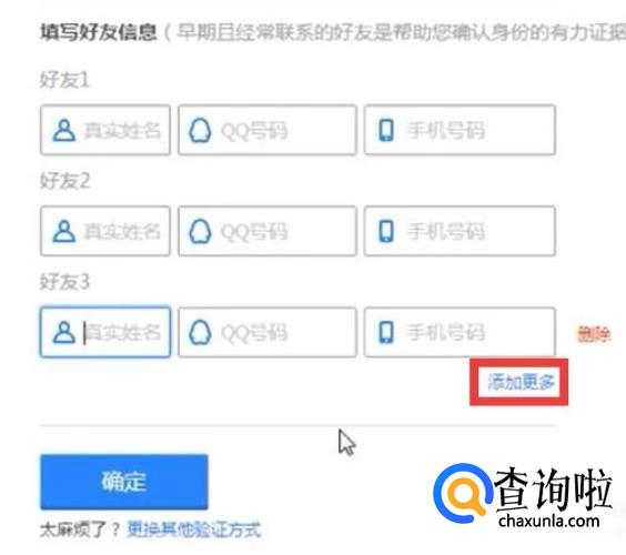 建议这里可以多添加几个好友信息,提高身份验证成功率。