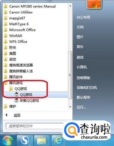然后在所有程序里面,找到我们需要设置快捷方式的应用程序,如图所示,我要把QQ游戏设置桌面快捷方式,就先后点击“腾讯游戏”、“QQ游戏”(两者都是文件夹的形式,说明点击之后还会有扩展),就看到QQ游戏的应用程序了。