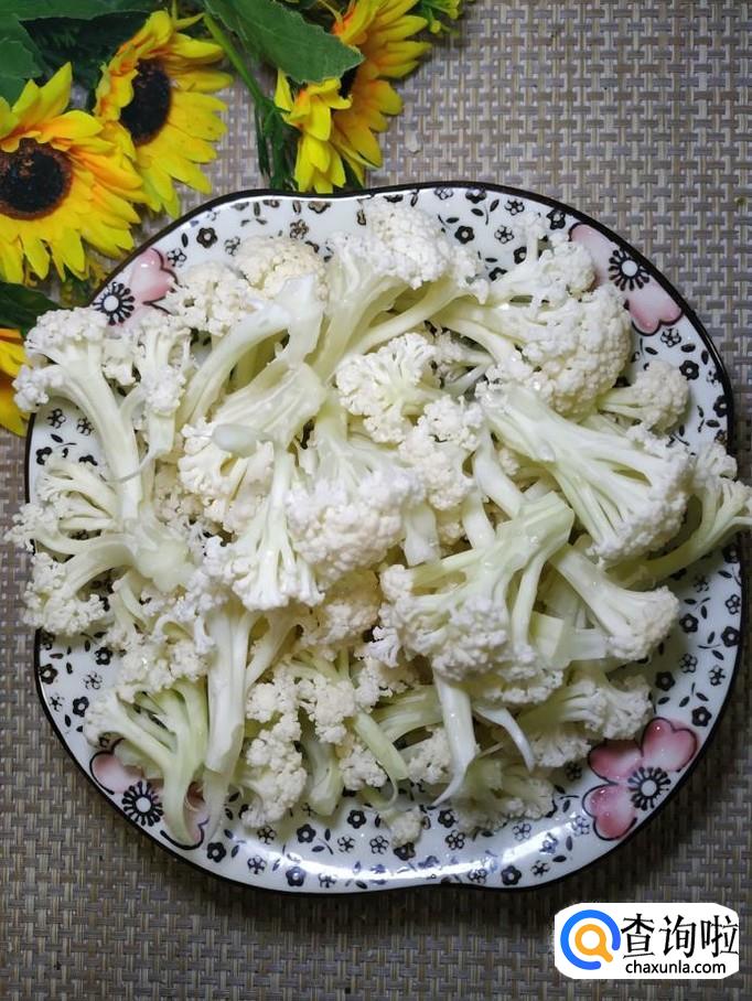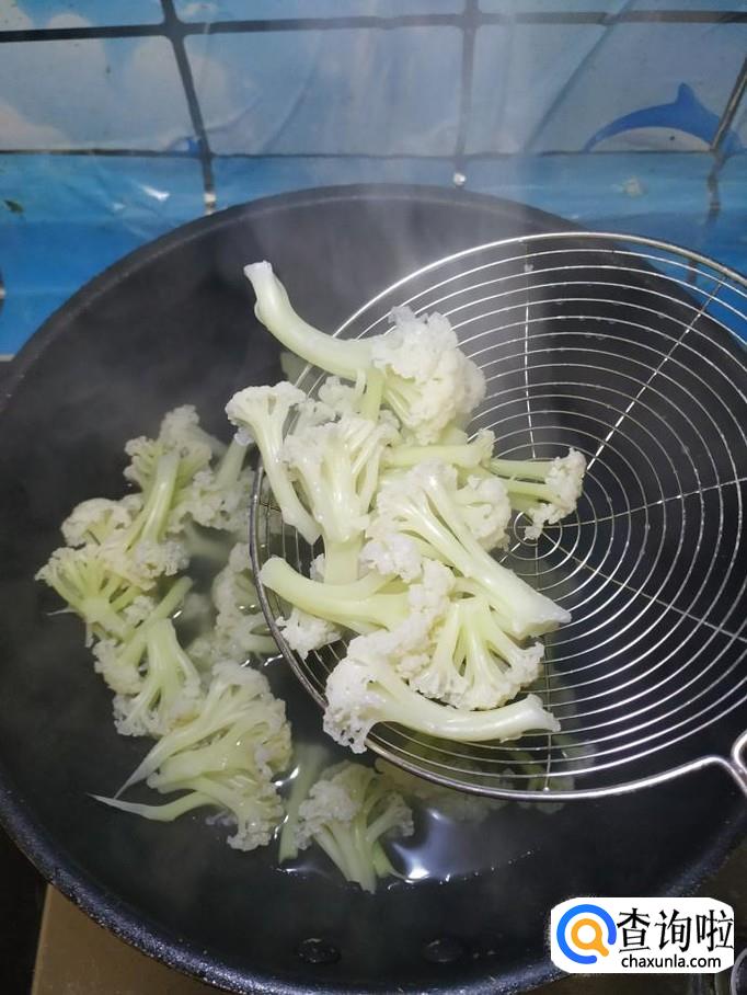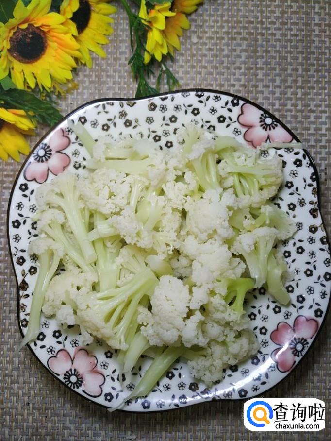 准备适量花菜,用手掰成小朵,洗净后,放入锅中焯水,焯至八成熟,盛出放入盘中备用。