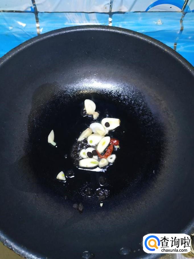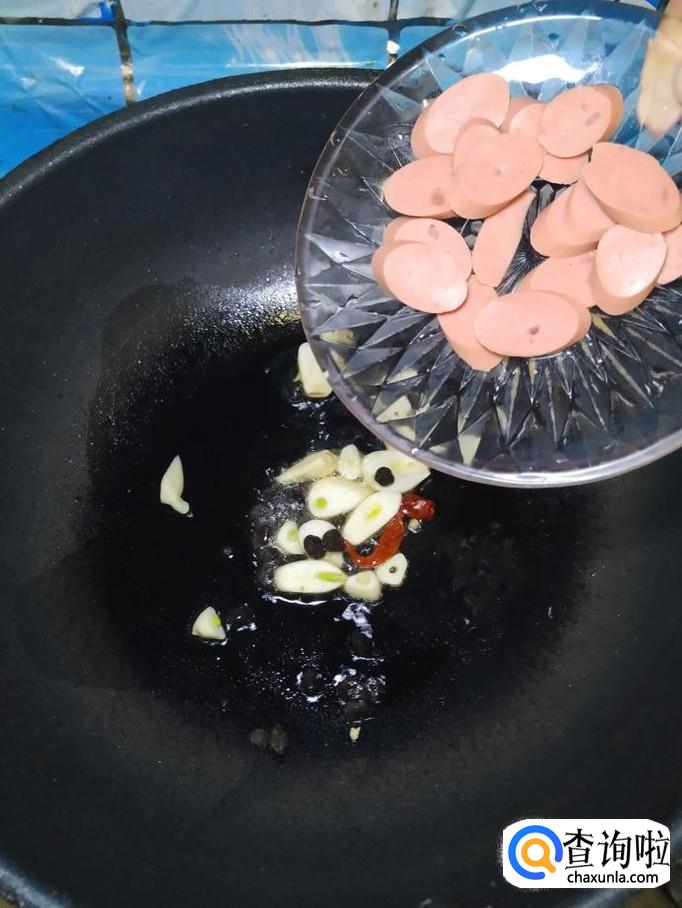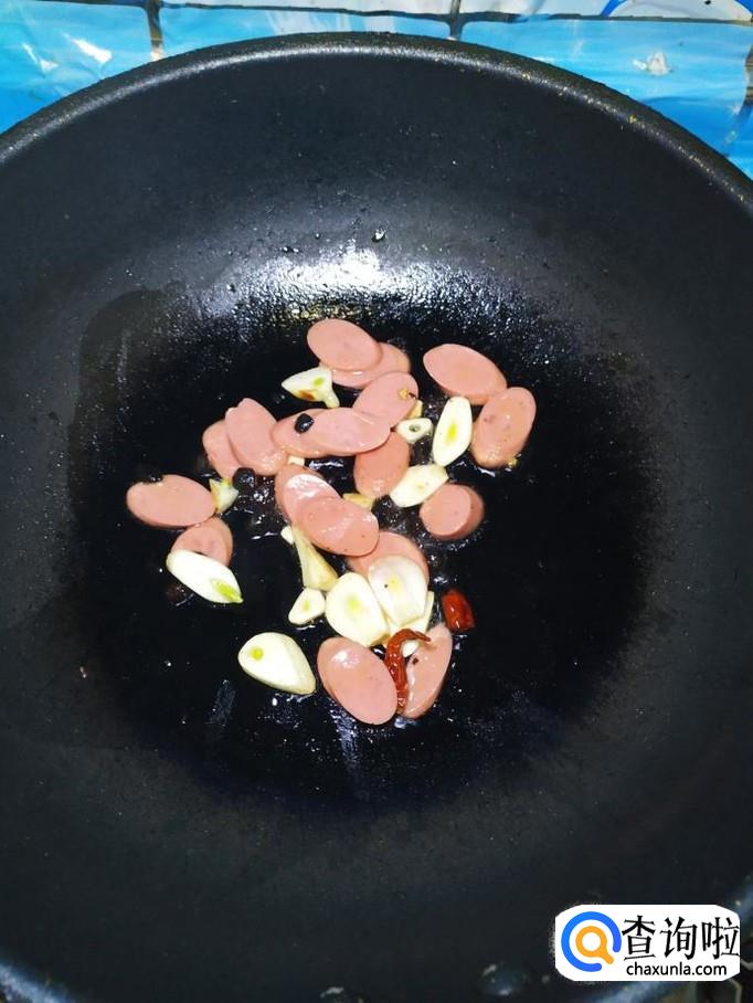 准备适量大蒜,去除外衣后,切成片备用,炒锅中放入适量油,油热后放入蒜片,干辣椒,豆豉炒香,然后将香肠倒入锅中,翻炒均匀。