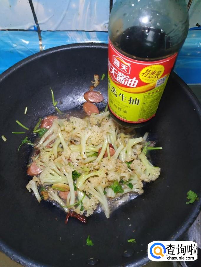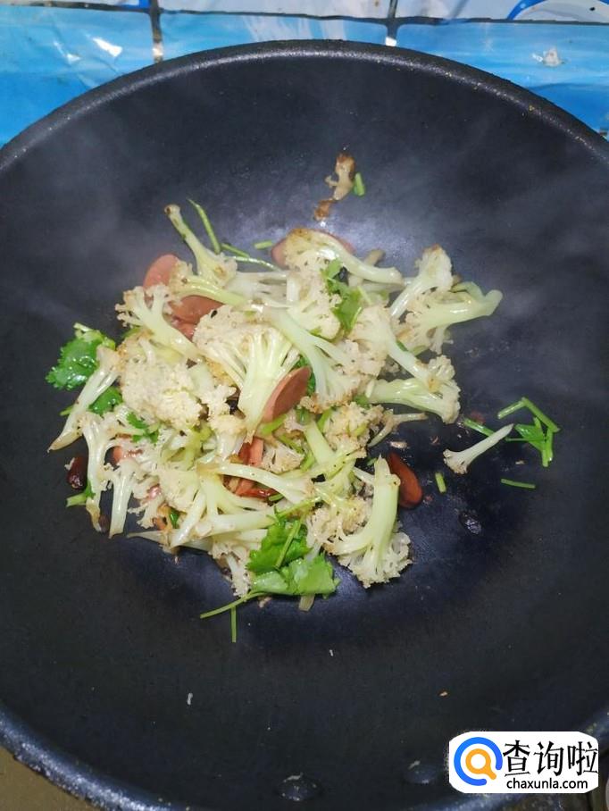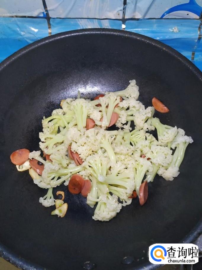 将准备好的花菜倒入锅中,和香肠一起翻炒均匀。