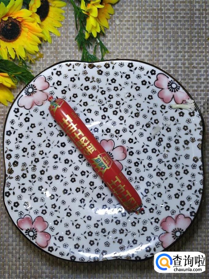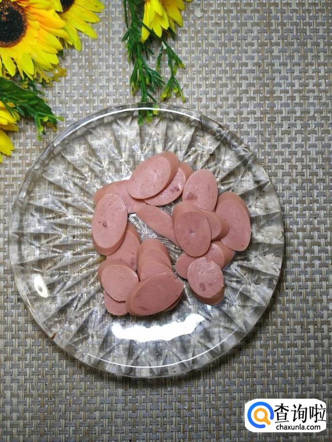 准备一根火腿肠,去除外衣后,切成片,放入盘中。