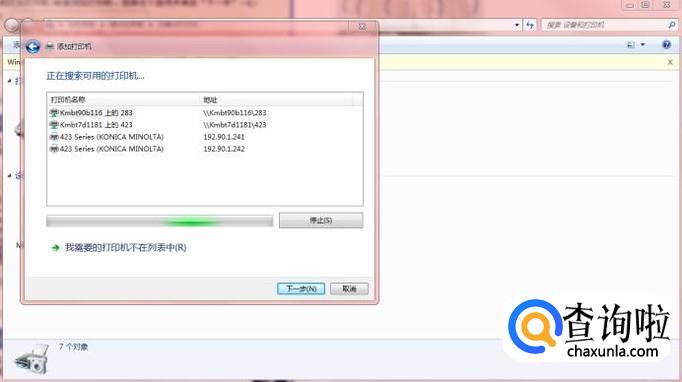 当你点击第二个选项之后,系统会自动浏览共享网络下的打印机,你只需稍作等待,打印机的种类就会出现