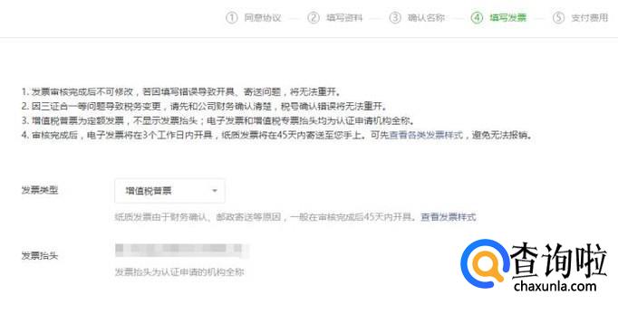 填完名称后,下面是发票信息的填写,完成后我们下一步就是微信支付300块钱认证费用后就可以了。期间会有客服给我们来电确认认证的相关信息,我们如实回答就可以了。