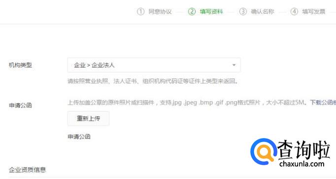 然后我们开始填写相关的材料,这里需要注意的是如果我们的微信公众号是企业的,那么我们需要提前将“申请公函”下载下来进行打印盖章后上传,填写完资料后点击下一步。