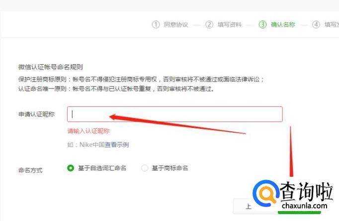 接下来是公众号名称的填写,这里我们也需要注意的是名称不得触犯他人的商标专用权以及帐号名不得与已认证帐号重复。否则审核不能通过。