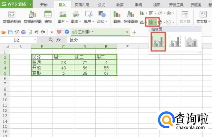 弹出的界面,我们点击组合图,弹出的界面,我们点击选中第一个组合图,这个组合图就是柏拉图;
