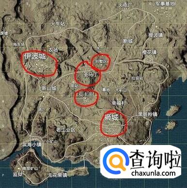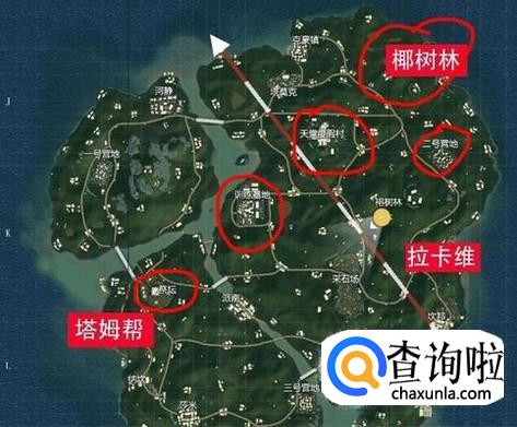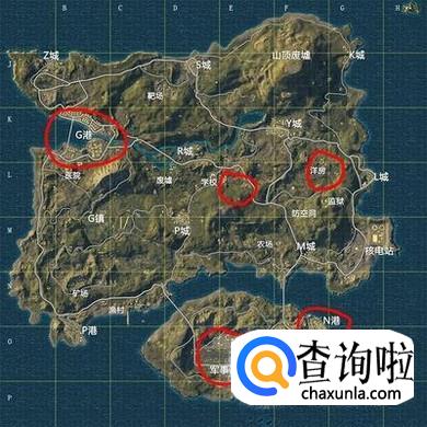 海岛地图:G港,防空洞,洋房,学校楼顶,军事基地,N港均有刷新,建议跳一波军事基地,因为这里分别在c字楼和铁塔顶上都有一把信号枪。