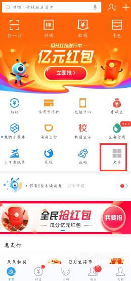 首先我们打开手机里的【支付宝】,并点击首页里的【更多】选项。