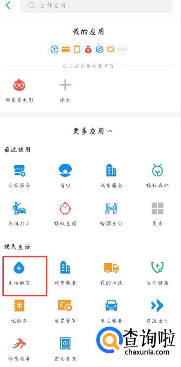 在新弹出来的界面中,找到【生活缴费】,并点击打开。