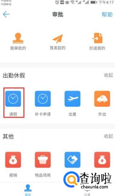 进入审批页面后,我们就可以看到请假了,我们点击请假;
