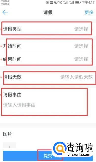 之后我们就可以根据我们的情况,选择请假类型,选择日期,填写请假原因等信息之后我们点击提交就可以了。