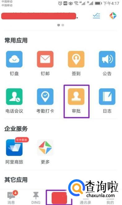 进入钉钉之后,我们点击中间的按钮,中间一般是一个公司的logo,之后我们点击审批;