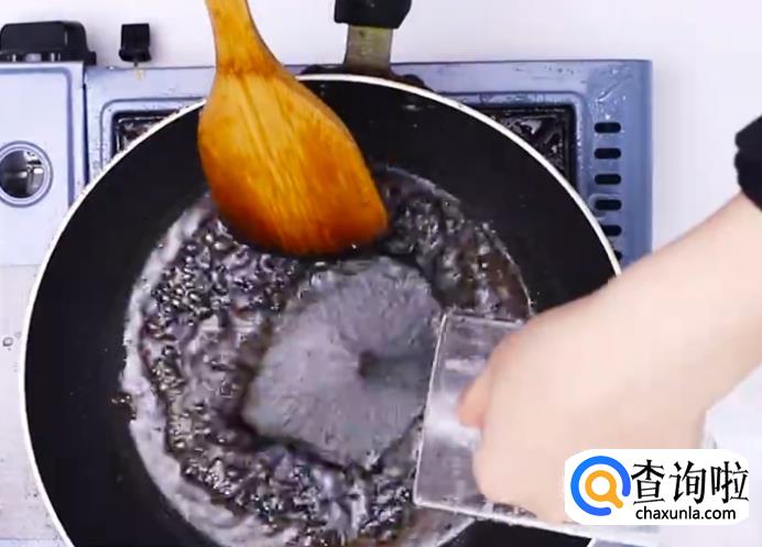 少量热油中倒入甜面酱翻炒,再加50ml清水,将甜面酱炒到冒泡泡。