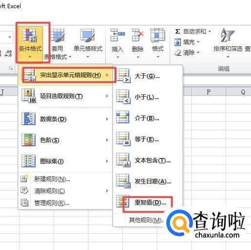 然后我们点击条件格式,之后点击突出显示单元格规则,然后点击重复值;