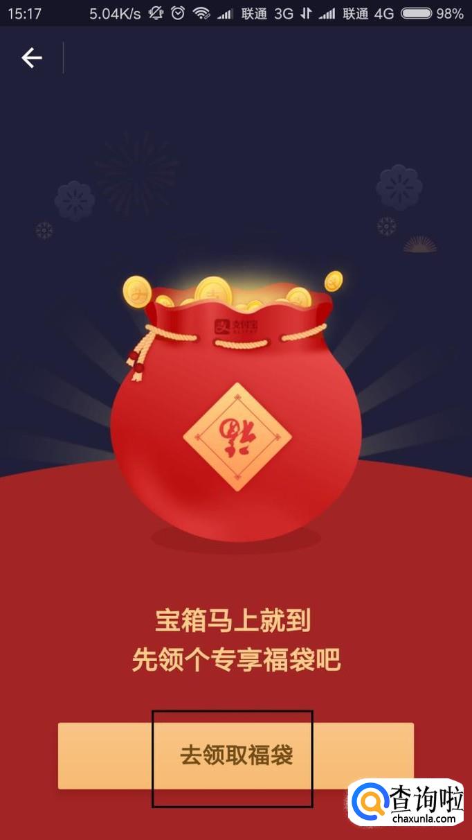 点击该宣传页之后,即可进入支付宝领取宝箱活动页面,我们可以先去领取福袋,点击该按钮即可。