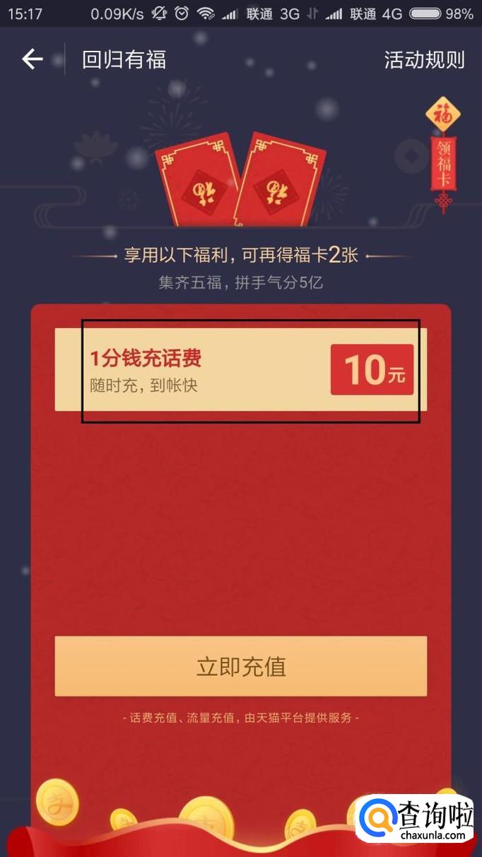 这里以一元钱充话费活动为例,点击“立即充值”按钮。