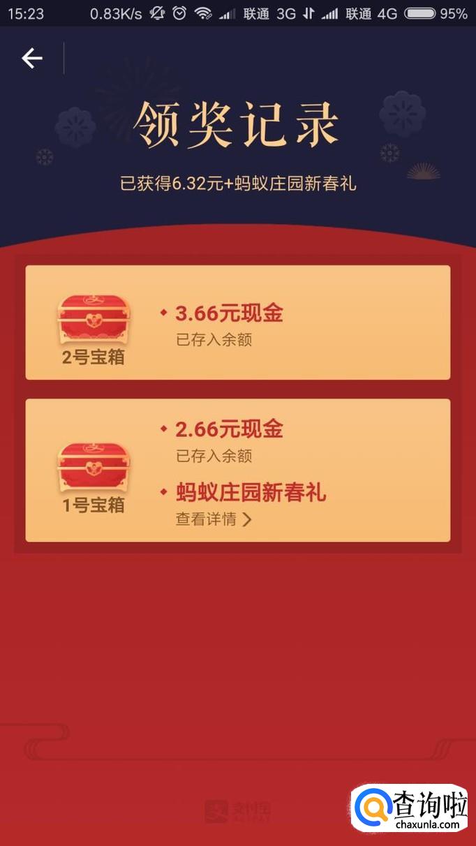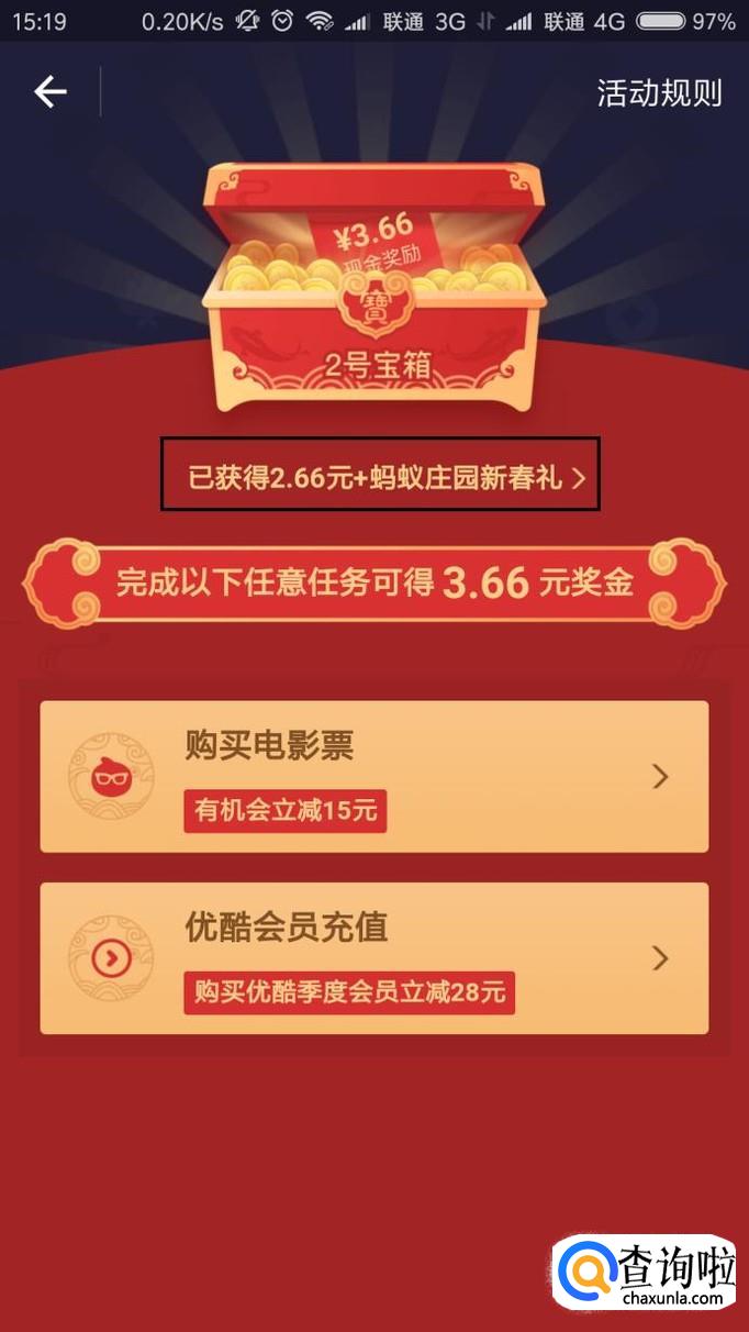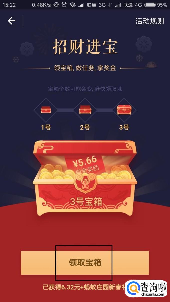 充值完毕之后,我们就可以领取到相对应的宝箱,这里是1号宝箱,开宝箱时我们可以获得奖励金,奖励金将直接充入支付宝账号,同时还可以获得福卡。