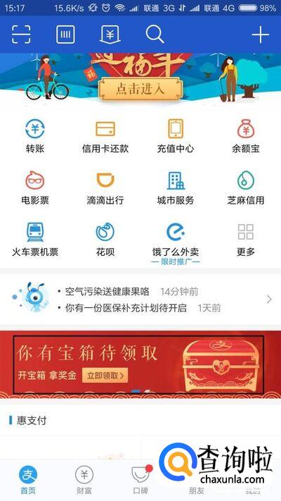 首先,我们打开支付宝客户端App,登录支付宝账号之后,在支付宝客户端首页可以看到“你有宝箱待领取”宣传页。