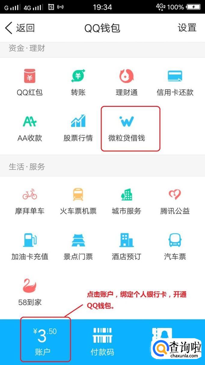 QQ钱包需要开通一下,点击左下角“账户”,绑定个人身份信息和银行卡,就可以开通了。在钱包界面,往下划动页面,在“资金理财”栏下面,可以看到“微粒贷借钱”图标,我们点击一下。