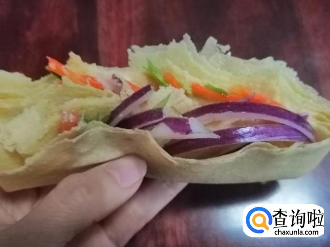 取出适量新鲜的粗粮煎饼,把煎饼铺平,放入调好入味的,圆葱胡萝卜拌葱丝,把煎饼如图所示折叠卷好,就可以享受美味了,这样我们好吃的三丝卷煎饼就做好了,原汁原味清香好吃。