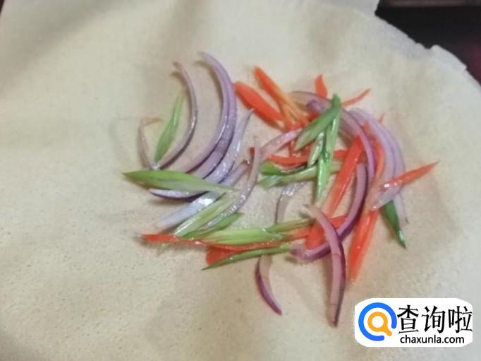 取适量新鲜的青葱叶,把葱摘掉黄叶,用清水把葱洗净,然后把葱切成细丝待用,用大葱也可以,主要选用青葱叶,是为了搭配另两个食材会更好看。