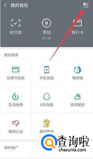 打开微信钱包,进入“我的钱包”页面后,点击右上角的四个框框。